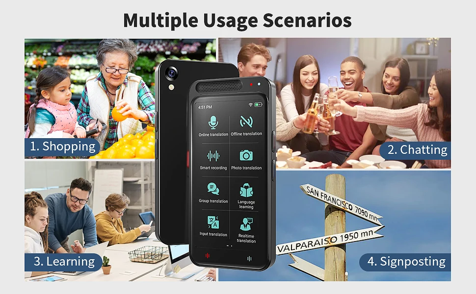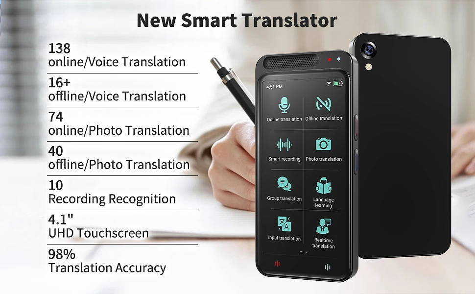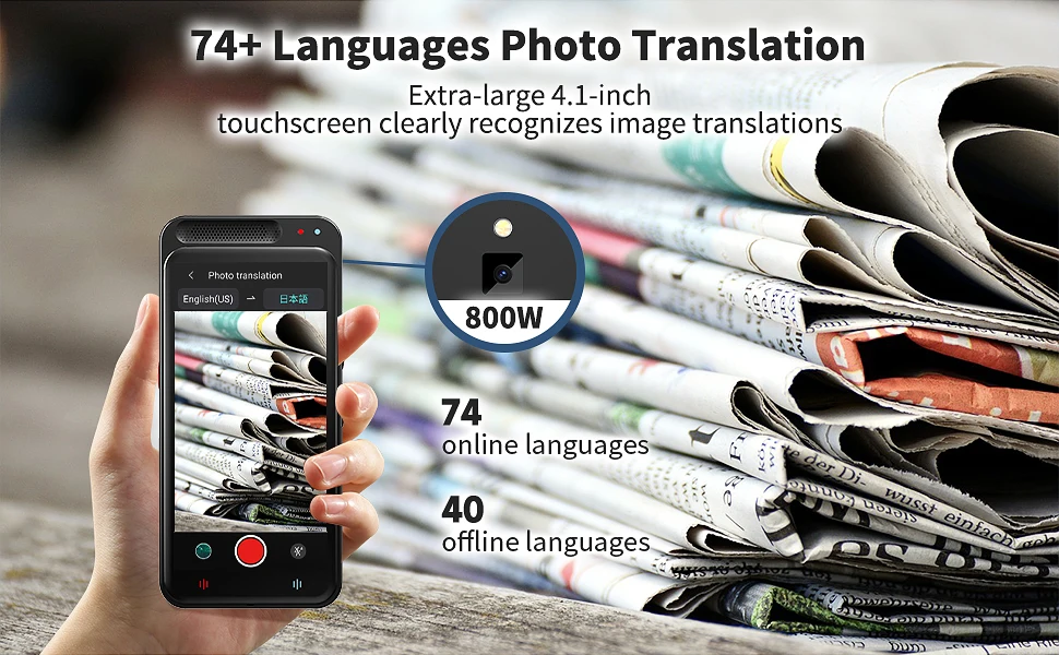 Our real-time language translation device is equipped with an 8-megapixel rear camera and professional OCR technology, which can translate images in 74 online and 40 offline languages. Simply point the camera at any text, and the instant translation device can automatically translate, allowing you to understand different language landmarks/menus/labels in seconds.